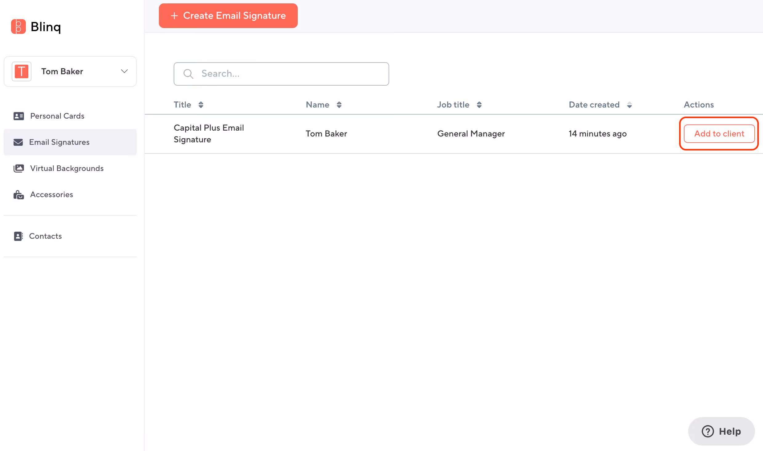 If you email signature has already been created either by yourself, or by your team if you are a member of a Business plan - click 'Add to Client'